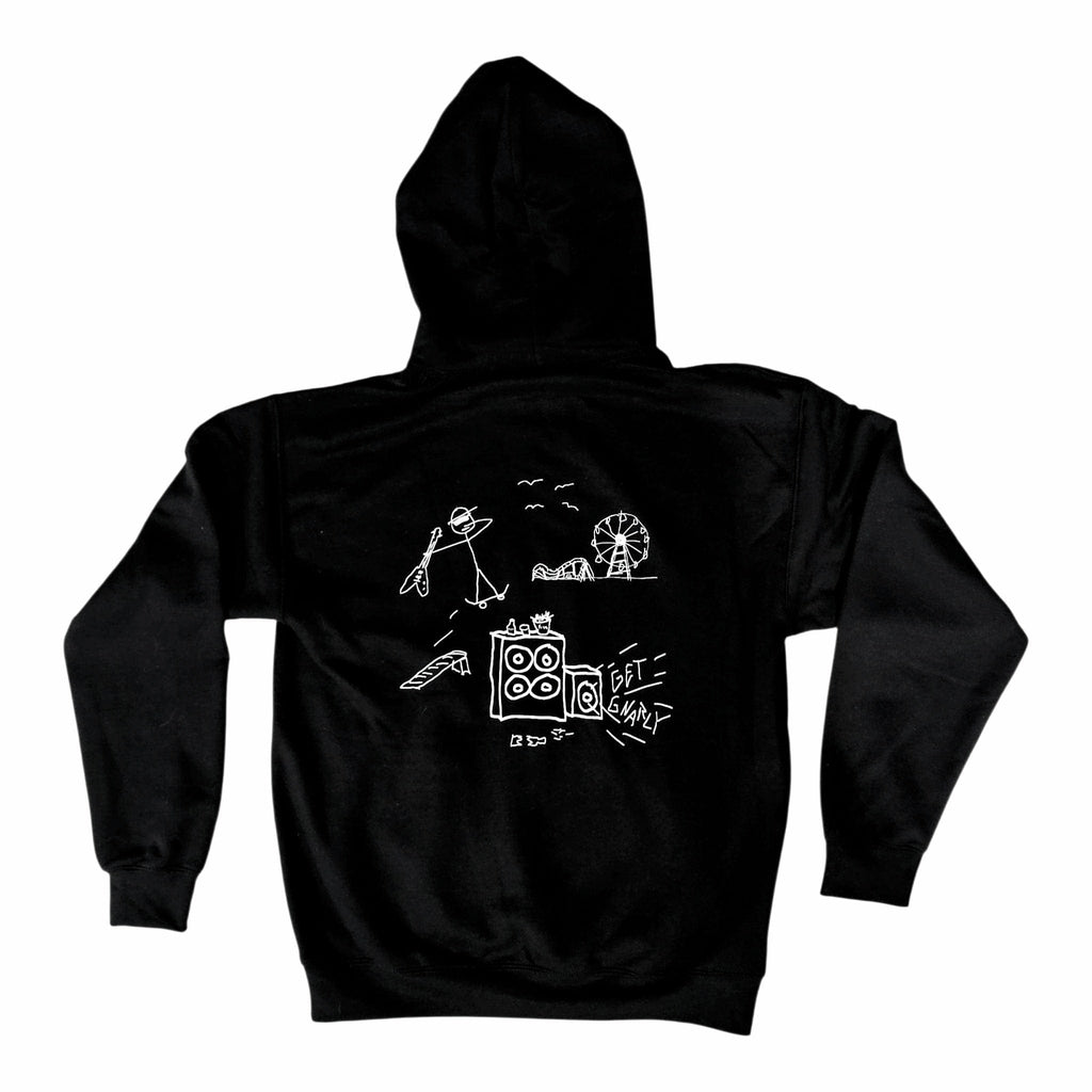The Get Gnarly Concert Pullover Hoodie features Get Gnarly Wave logo on front left pocket and Stick figure graphic of "Oceans Calling" stage setup in the sand on the center back of a Pullover Hoodie, with a front pouch pocket, and a draw cord hoodie.